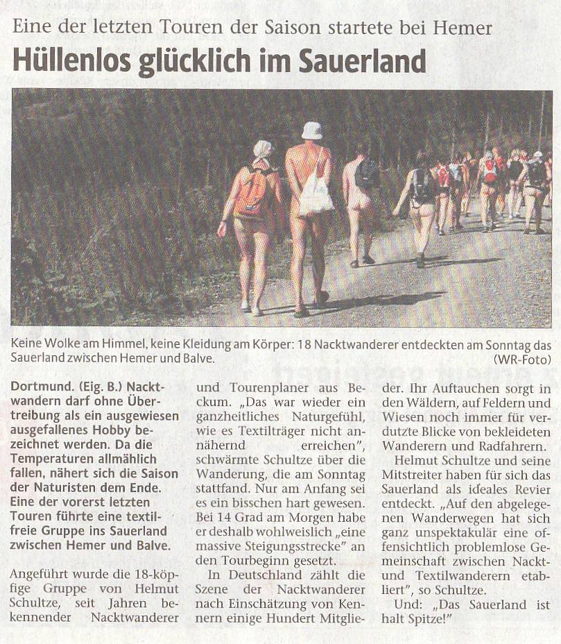 Mais la presse de la Ruhr avait également découvert le thème de la « randonnée nue », et un reportage sur la randonnée d'Iserlohn est paru dans la Westfälische Rundschau (WR). Entre-temps, les randonnées nues du Sauerland étaient devenues permanentes - et en 2009, elles allaient se poursuivre !