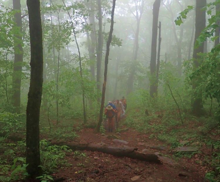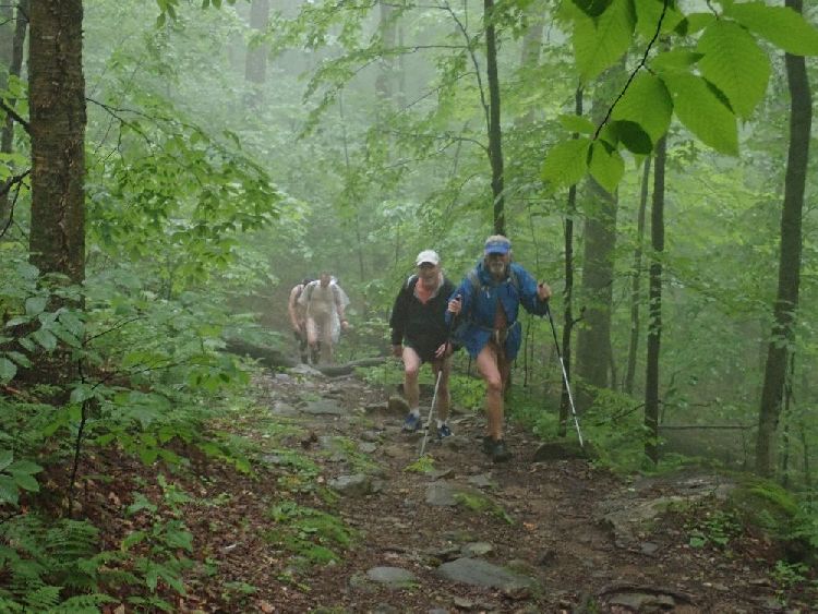 La 'randonnée du solstice d'été' dans le Vermont a eu lieu, comme toujours jusqu'à présent, sur le tronçon du Long Trail/ Appalachian Trail entre Wallingford et le Mt Tabor. Cette année, malgré les prévisions météorologiques décourageantes qui annonçaient quelques douches matinales puis un peu de soleil, les participants étaient au nombre de 11. Mon ami Dan et moi avons passé la nuit au refuge Big Branch, près du point de départ de la randonnée, et nous sommes partis dans le brouillard et sous la bruine. En raison de la pluie qui tombait depuis plusieurs jours, les chemins étaient boueux et parfois humides, et les ruisseaux étaient pleins. Néanmoins, nous avons pu passer partout, même à pied sec.
