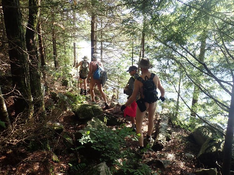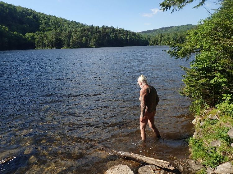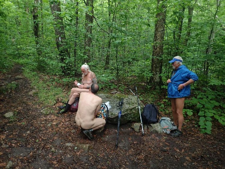 Près de la fin de la randonnée habituelle du solstice d'été, nous sommes arrivés à Little Rock Pond (étang rocheux). C'est un beau lac avec un terrain de camping. Comme il se trouve à un peu plus de deux miles de la route par un sentier rocailleux et cahoteux, un certain nombre de visiteurs viennent uniquement pour camper, et un gardien y vit également sous une tente en été. Il n'était pas là quand nous sommes passés, mais nous l'avons croisé sur le chemin avec des outils pour creuser des tranchées de drainage, et nous avons échangé quelques mots avec lui. Notre nudité n'a pas été un sujet de discussion. Puis, peu après, nous avons rencontré deux femmes avec quelques jeunes enfants, et l'une des dames a compté aux enfants : "Ça fait 8 personnes nues jusqu'à présent, non ?" et à nous : "Amusez-vous bien, tous ensemble". Finalement, à quelques mètres de la fin de l'itinéraire, nous avons rencontré un couple d'une quarantaine d'années, complètement nu et avec un grand sourire. Apparemment, ils avaient rencontré plus tôt la première partie de notre groupe sur le parking et avaient déjà entamé la conversation sur le Naked Hiking Day, et avaient décidé de continuer à marcher nus.