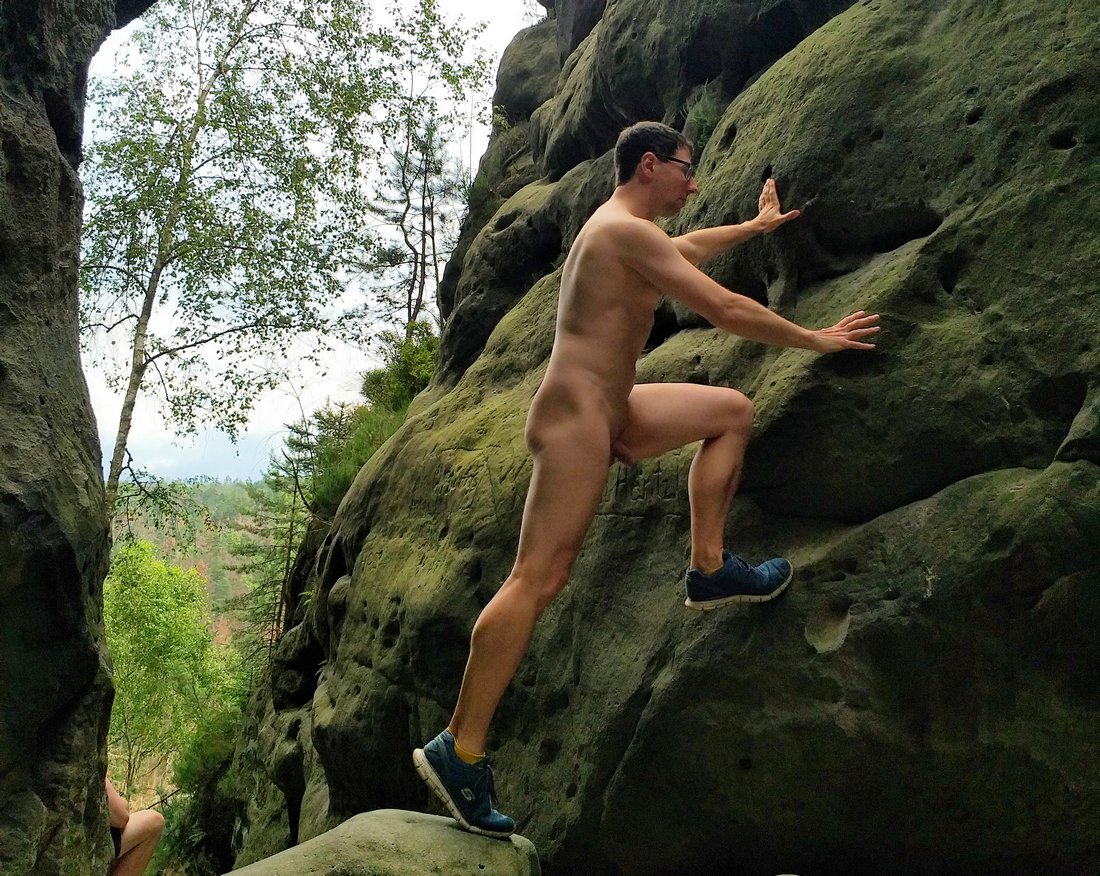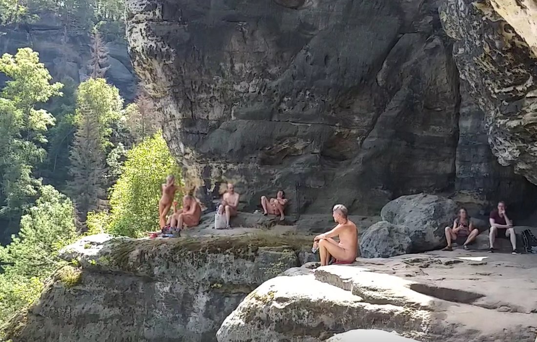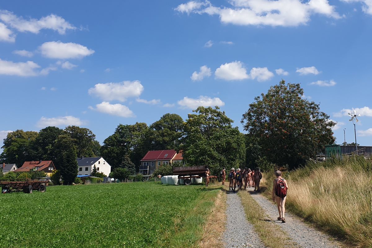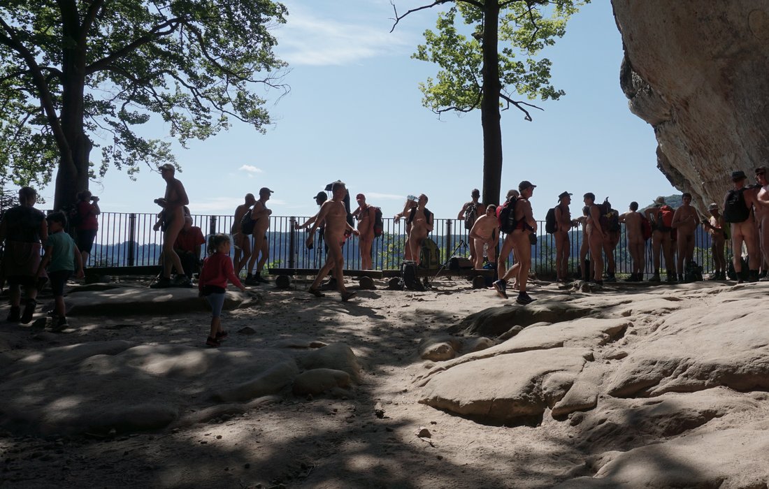 38 naturistes* se sont réunis à Ottendorf au domicile du FeWo pour la randonnée du samedi, d'où le premier kilomètre jusqu'à la limite du village a été couvert de vêtements. Ensuite, l'Arnstein tout proche a été escaladé. La montée partiellement raide comportait quelques passages où il fallait se faire petit et mince ou utiliser ses bras pour atteindre sa destination.
