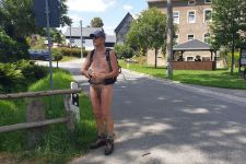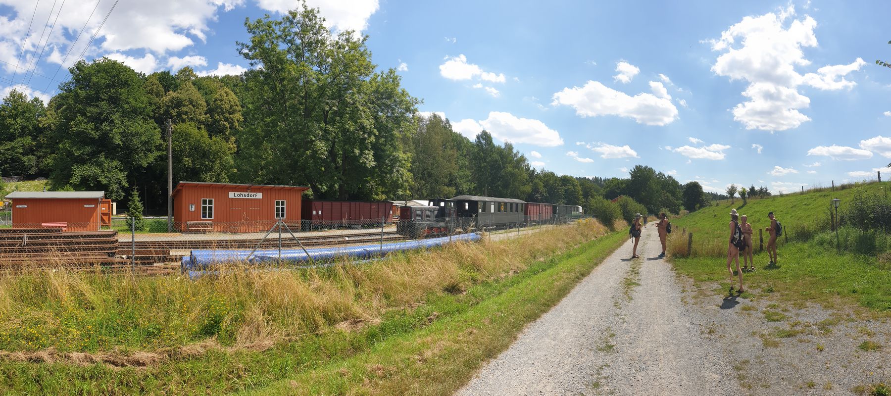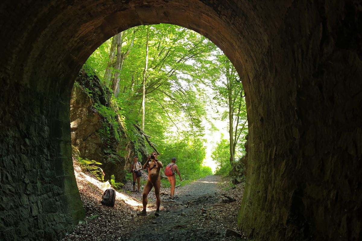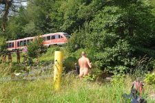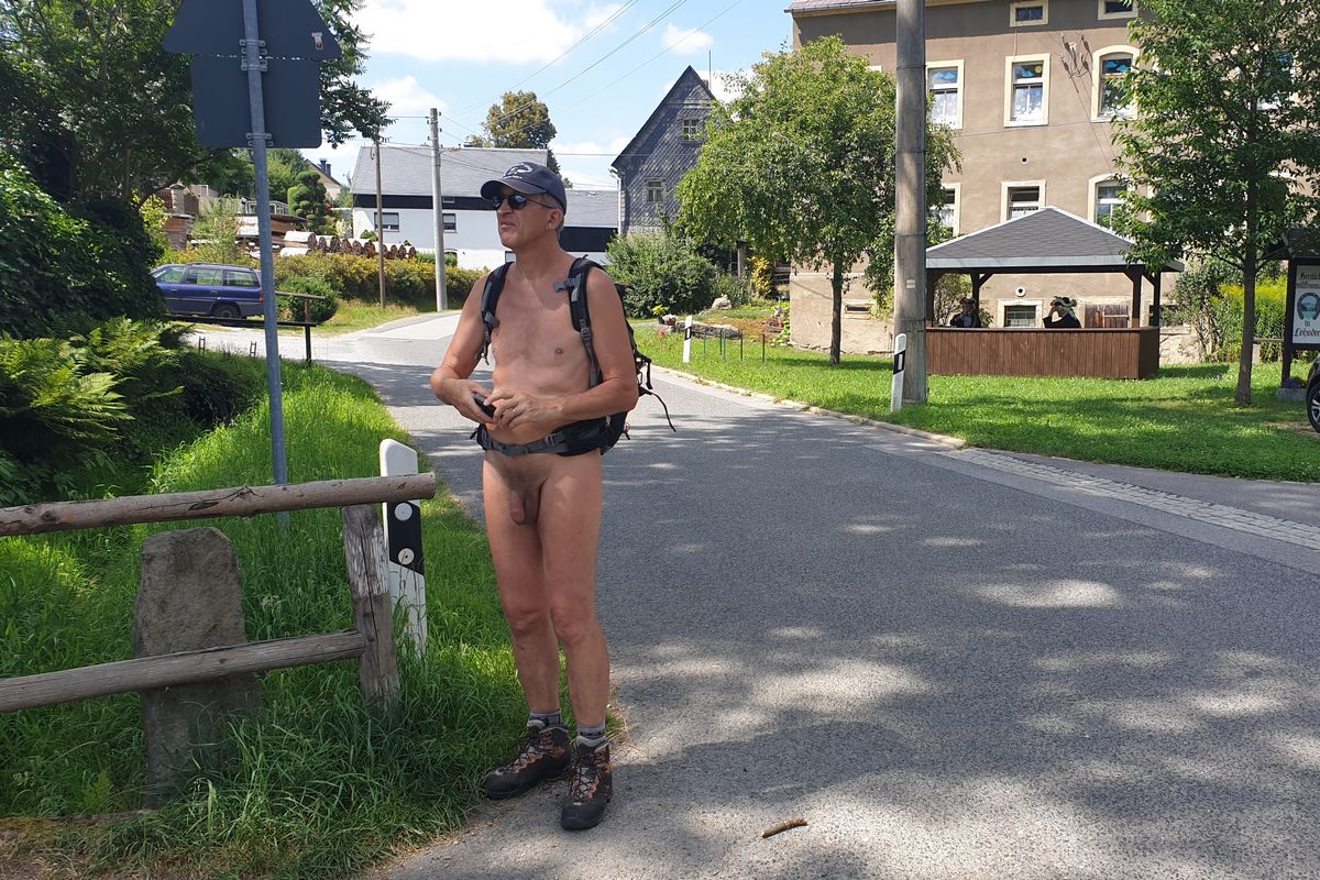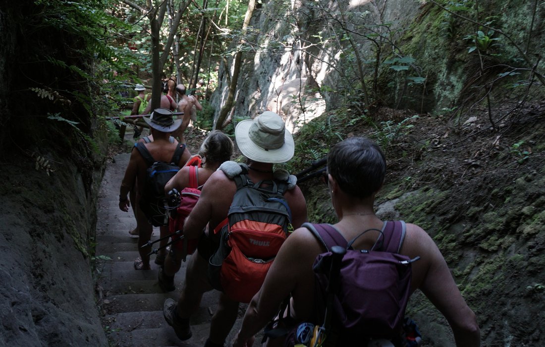 38 naturistes* se sont réunis à Ottendorf au domicile du FeWo pour la randonnée du samedi, d'où le premier kilomètre jusqu'à la limite du village a été couvert de vêtements. Ensuite, l'Arnstein tout proche a été escaladé. La montée partiellement raide comportait quelques passages où il fallait se faire petit et mince ou utiliser ses bras pour atteindre sa destination.