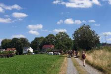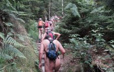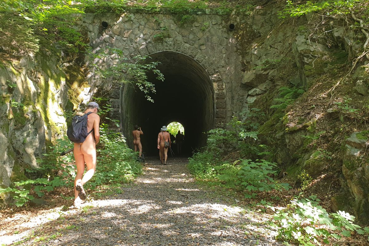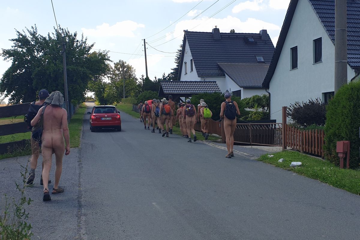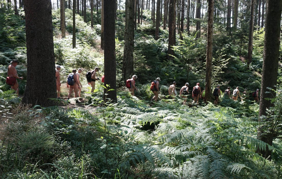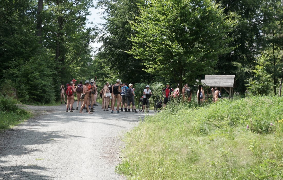 Sur les chemins, pour la plupart étroits, le groupe de randonnée nu de 36 personnes se réunissait sans cesse avec les groupes et les familles qui venaient, de sorte qu'il y avait régulièrement de petits embouteillages pour laisser passer les personnes qui venaient. La plupart du temps, il y avait aussi des conversations et deux jeunes femmes avec des chiens étaient même intéressées par la possibilité de se joindre à l'une des promenades des jours suivants.