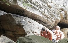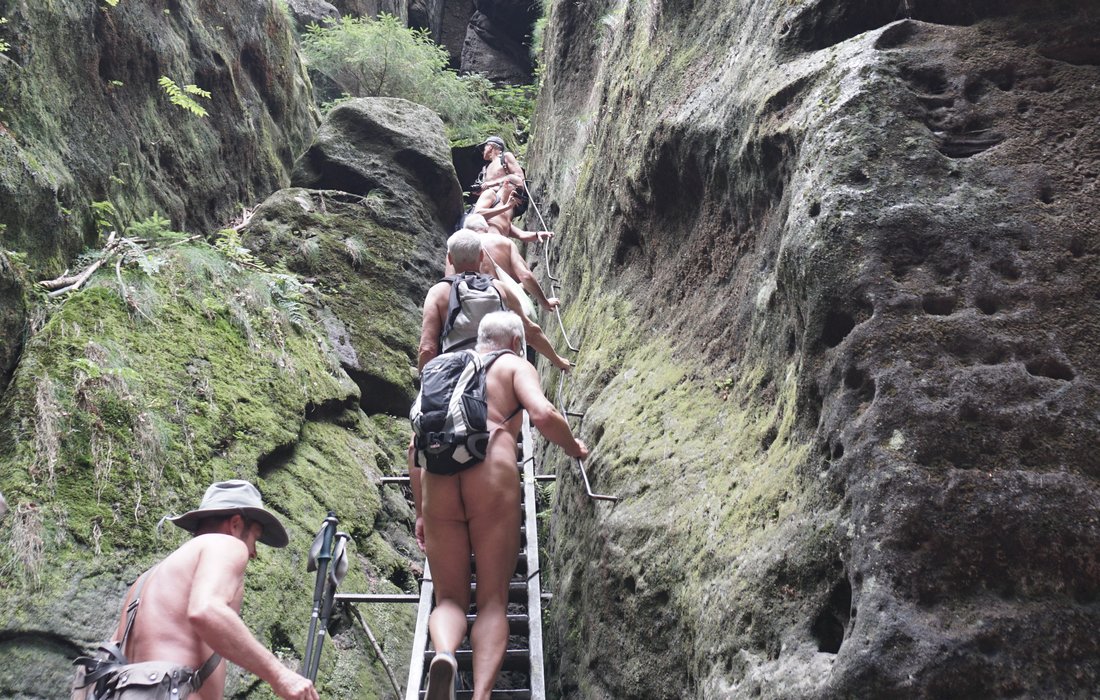 Ensuite, les 31 randonneurs naturistes ont atteint l'étage supérieur de l'étable à vaches ("Neuer Wildenstein") par l'échelle du ciel de 35 cm de large, qui est construite dans une étroite crevasse de pierre. Ici aussi, les groupes habillés et les nombreuses familles étaient majoritaires, et beaucoup d'entre eux nous ont posé des questions avec intérêt, de sorte que plusieurs séries de discussions sur notre façon de faire de la randonnée se sont développées. La site »nackt minus wandern punkt de« de nombreuses personnes ont mémorisé pour en savoir plus.