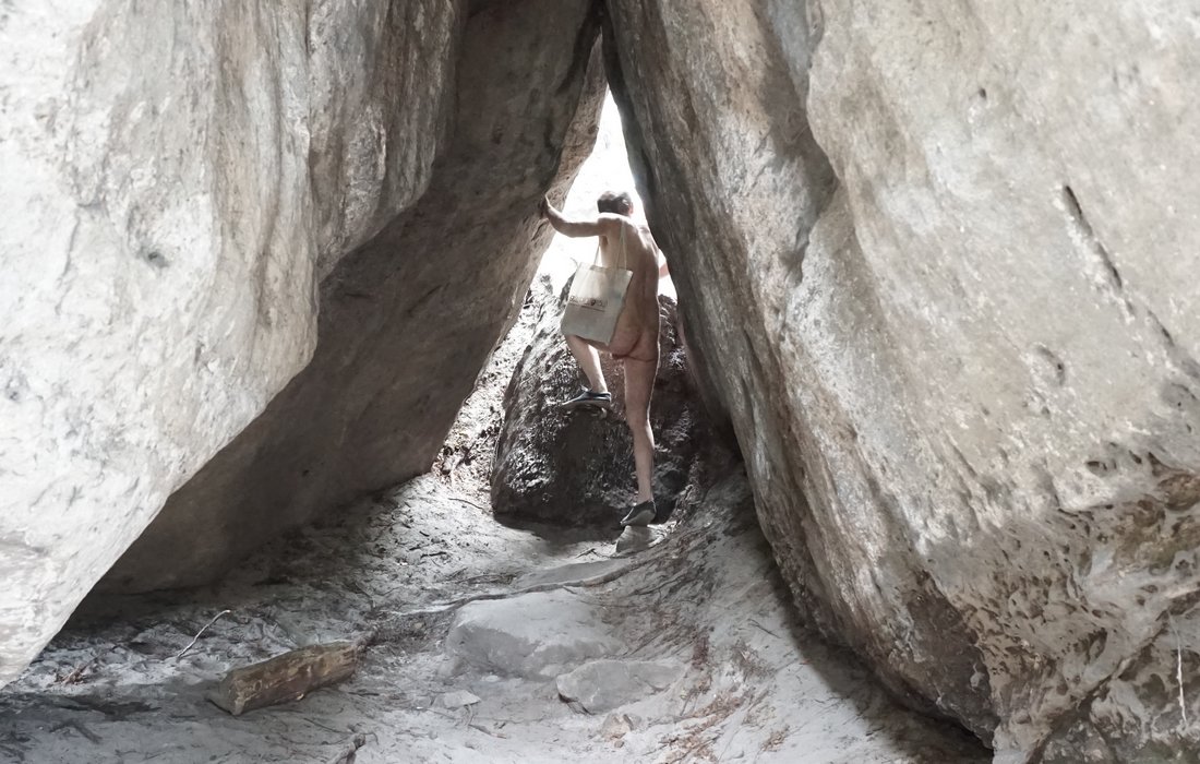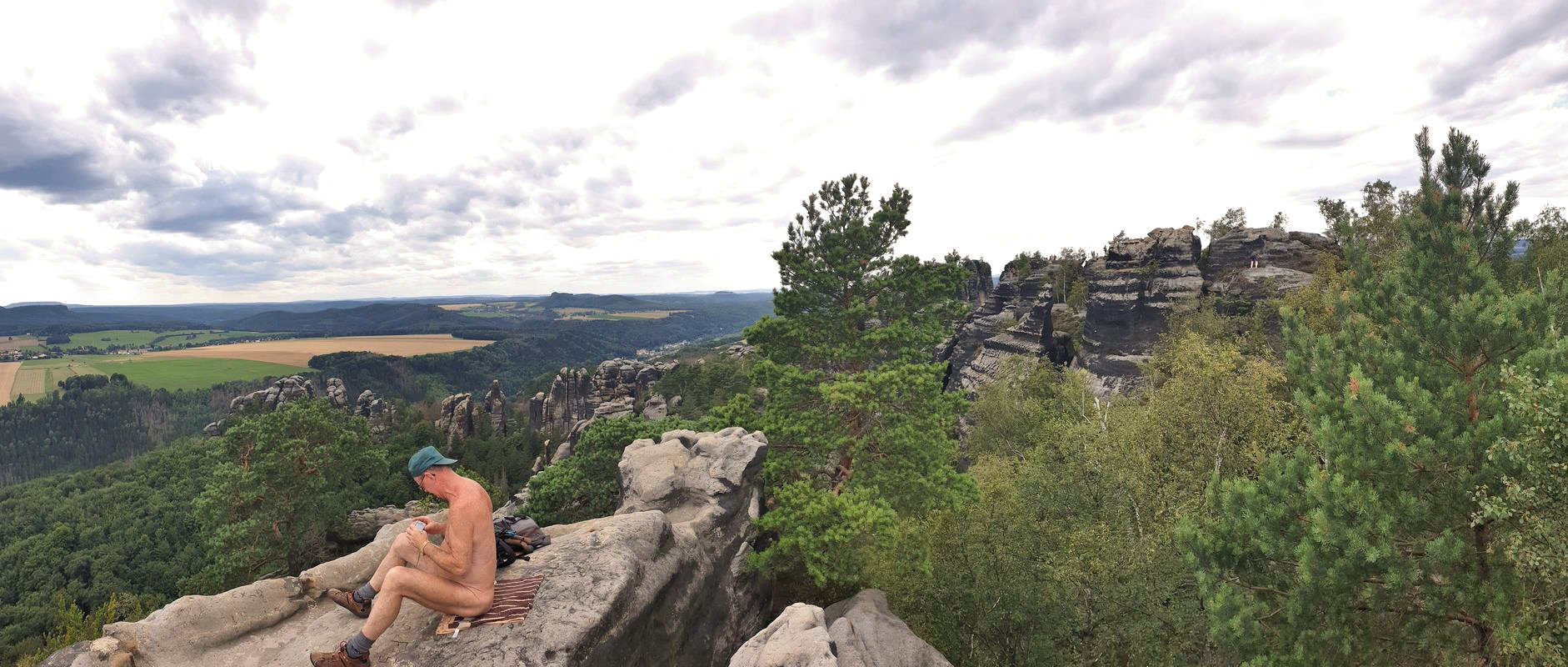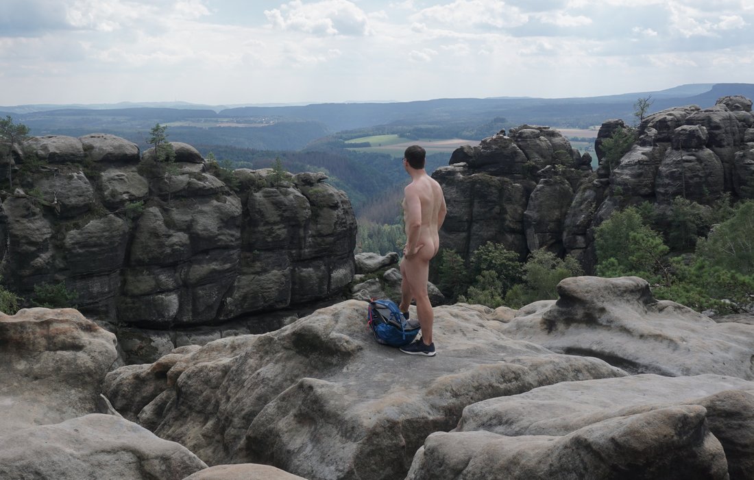 La pluie a accompagné l'ascension du "Winterstein", également appelé "Hinteres Raubschloss". Nous y avons trouvé un lieu de repos sec avec une vue dans une grotte. Dans la grotte, nous avons discuté avec des jeunes qui ont essayé de se sécher à nouveau après l'ascension avec des vêtements et une protection contre la pluie. "Oui, vous le faites bien. Nous aimerions nous promener nus, mais il n'y a pas de place pour ranger nos vêtements". Les transporteurs de textile s'arrêtent: quand il s'agit de randonnées à poil, ils ne manquent pas d'excuses.
