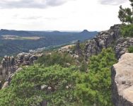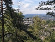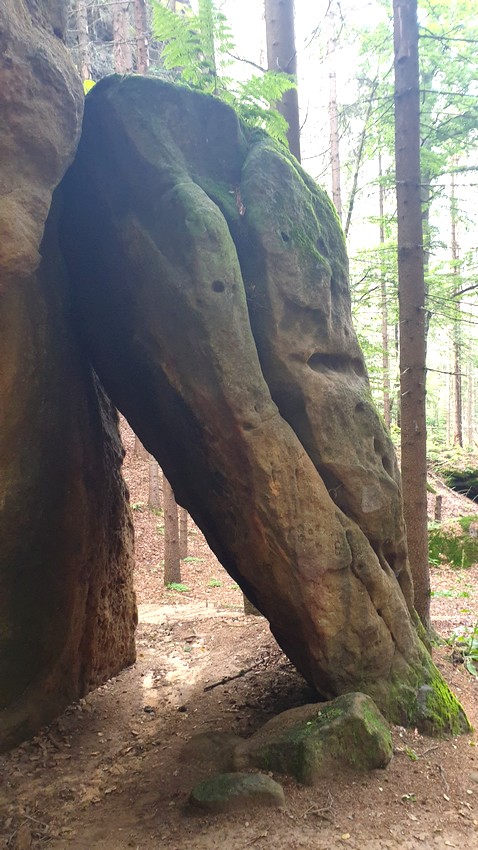 La pluie s'est progressivement retirée et a fait place aux premiers rayons de soleil. Au cours de l'après-midi, le soleil a pris le dessus. Nous avons quand même passé la "Marienhöhle" et nous sommes ensuite montés au "Bärfangkegel". Le long de la crête de la montagne, il y avait d'autres vues sur les formations de pierre voisines.