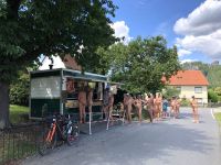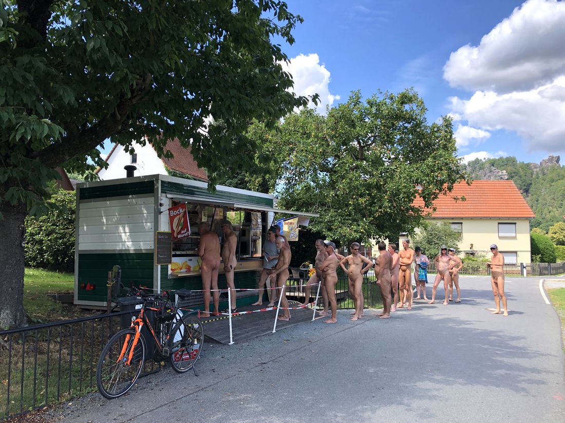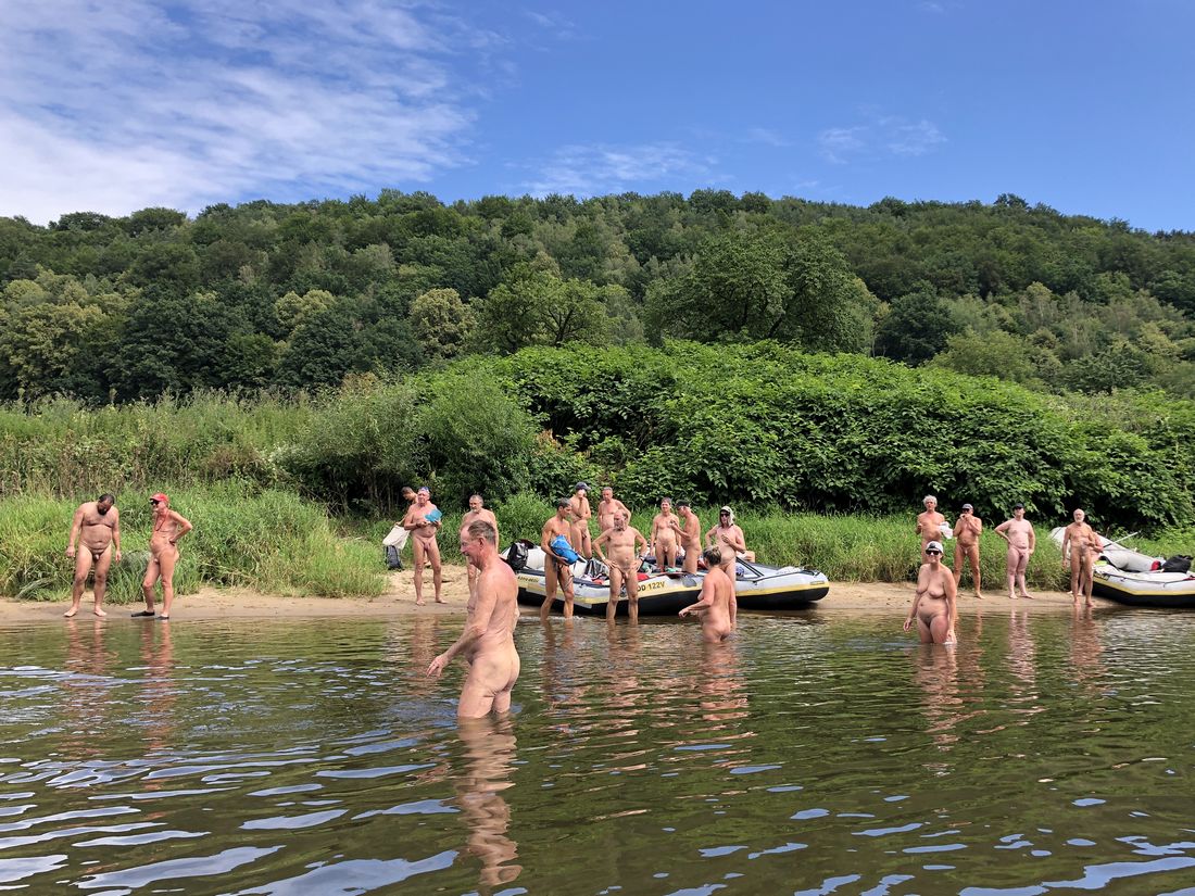Déjà en 2018 et 2019, la possibilité de pagayer nue depuis l'eau dans la vallée de l'Elbe a été acceptée avec plaisir. Cette fois-ci, 25 naturistes se sont intéressés à la question et sont partis de la cabane en bus pour se rendre à Bad Schandau. 24 d'entre eux ont été distribués à trois canots pneumatiques, un a préféré un kayak à sens unique.