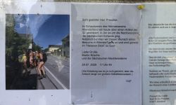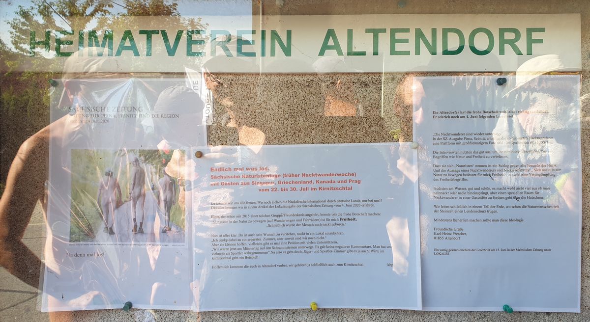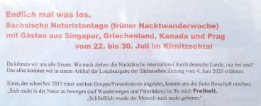 Nous avons découvert que l'association d'histoire locale du village avait annoncé nos randonnées nues autour du Kirnitzschtal sur son panneau d'information sous la devise "Enfin quelque chose se passe". Il a été fait référence à un article dans le Sächsischen Zeitung.