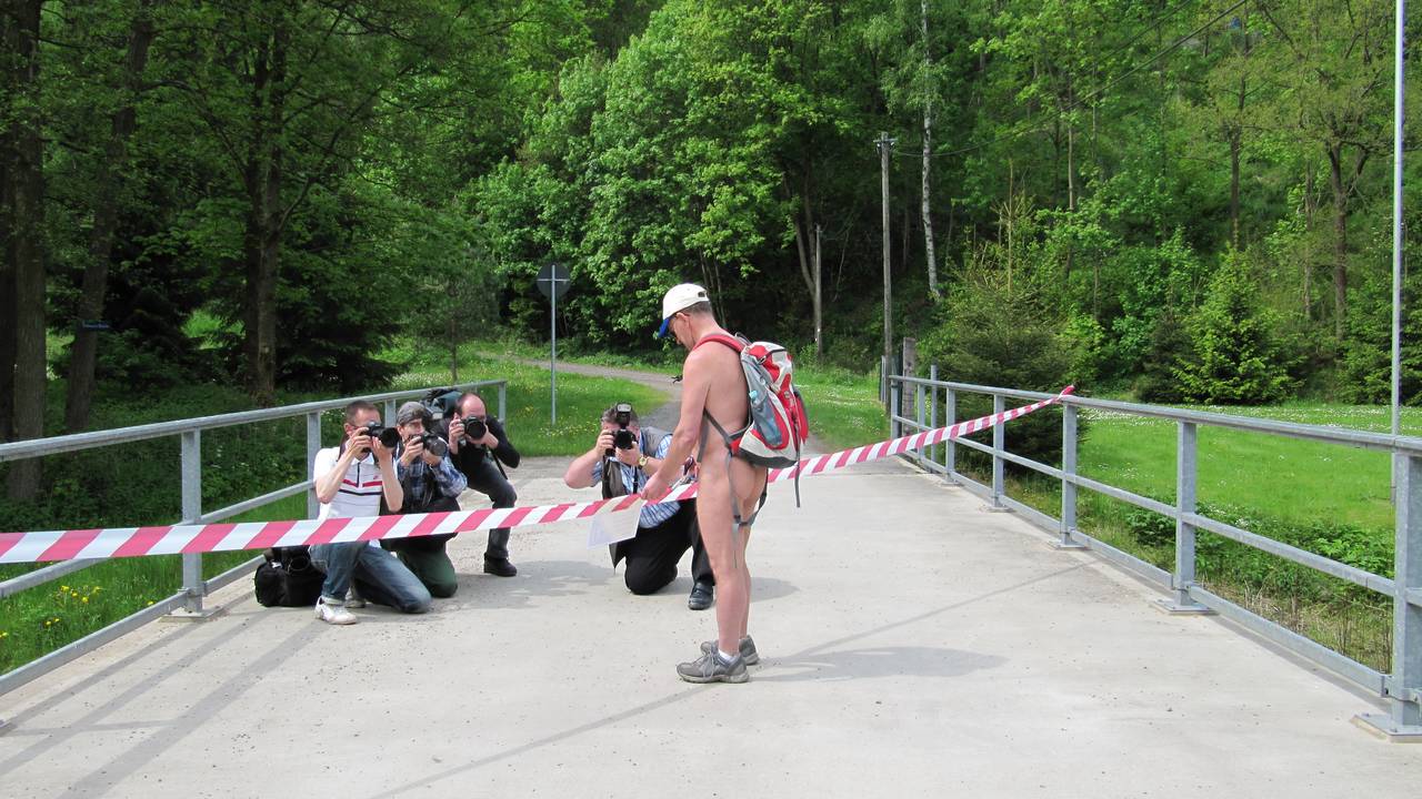 Pour l'inauguration, plus de 20 randonneurs nus se sont rassemblés sous le mur du barrage, où quelques stands d'information avaient été installés pour les visiteurs et où une barrière rouge et blanche était attachée en travers du sentier, que Horst a coupée tout en appuyant avec empressement sur l'obturateur de la caméra : "J'ouvre par la présente le Harzer Naturistenstieg, le premier sentier de randonnée nu officiel en Allemagne."