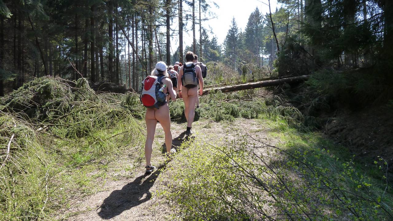 Sur le chemin du retour, nous avons atteint un endroit où une tempête de mars, quelques semaines avant notre randonnée, avait fait tomber quelques conifères sur une distance de 100 mètres. Les escalader était une affaire assez piquante pour les randonneurs et randonneuses nus ! Le passage était particulièrement désagréable pour les randonneurs pieds nus, qui devaient d'abord aplanir à chaque pas les aiguilles d'épicéa et de pin dressées...