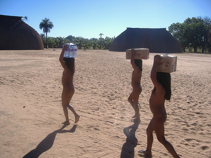 Le mode de vie proche de la nature des peuples indigènes, par exemple celui des Yawalipiti dans la région du Xingu, a longtemps été considéré par les naturistes comme un modèle pour leur propre attitude. Entre-temps, cette fonction de modèle s'est toutefois perdue, car la plupart de ces peuples ont depuis longtemps atteint la civilisation : les enfants Yawalipiti sur la photo de droite transportent dans leur village de l'eau dans des bouteilles en plastique jetables, en plus d'autres aliments transformés et emballés industriellement. Les bouteilles finissent-elles dans l'Amazone via le fleuve Xingu et donc dans la mer ? Ou les villages Yawalapiti sont-ils reliés à un système de recyclage ?