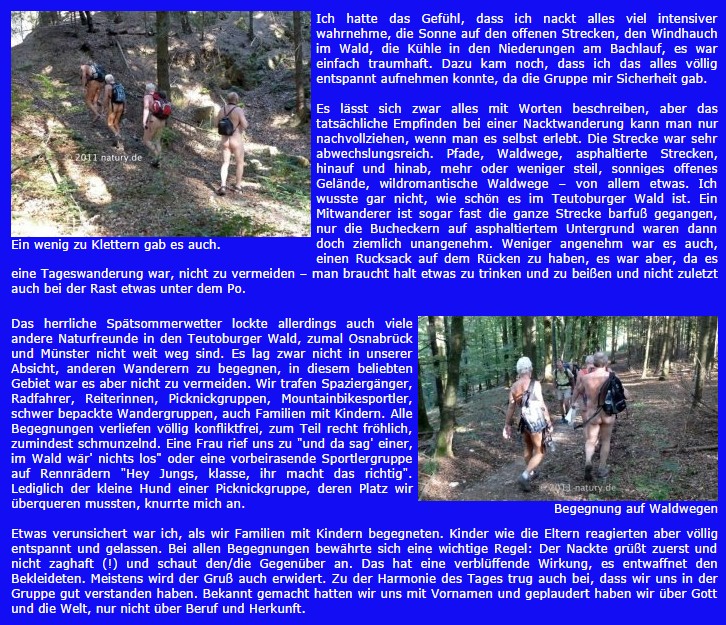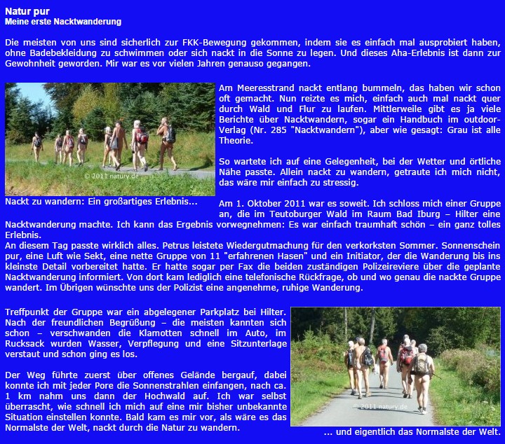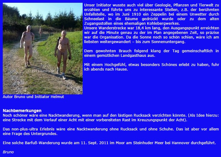 Mais c'était aussi la première randonnée nue pour Bruno, un ami naturiste de longue date du club naturiste de Münster. Nous avons inclus son rapport très personnel dans 3 copies d'écran du site web de natury de 2011 dans la galerie de cet article.