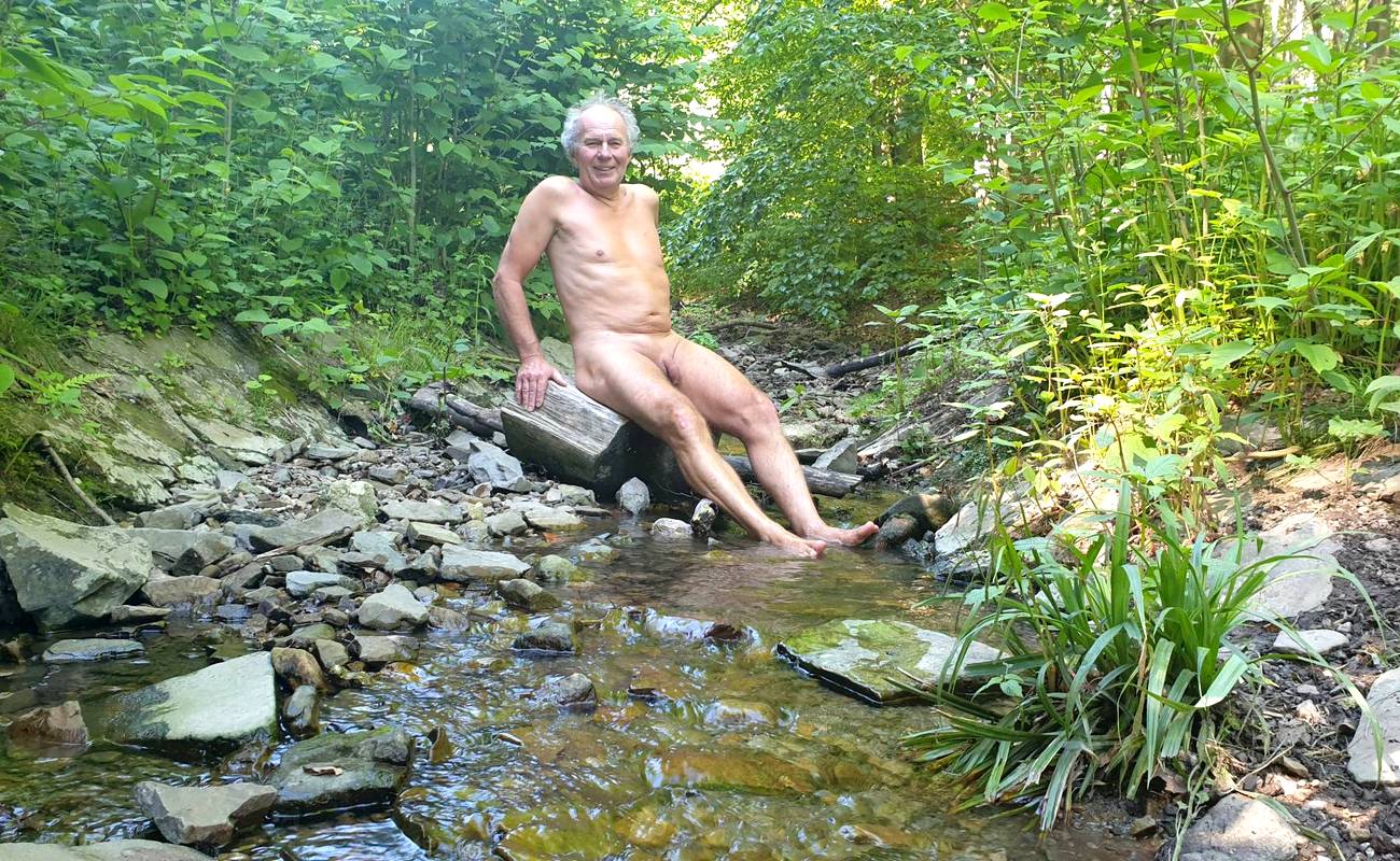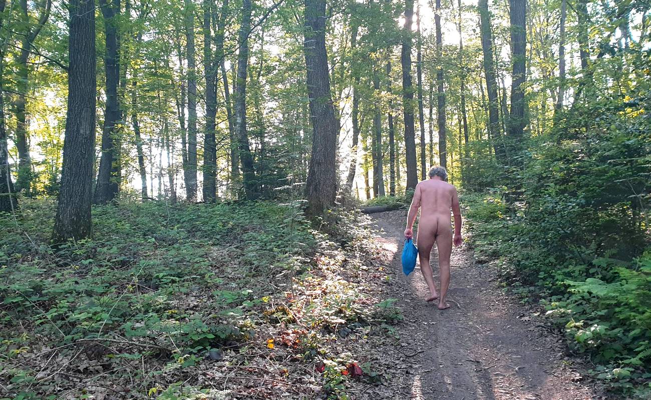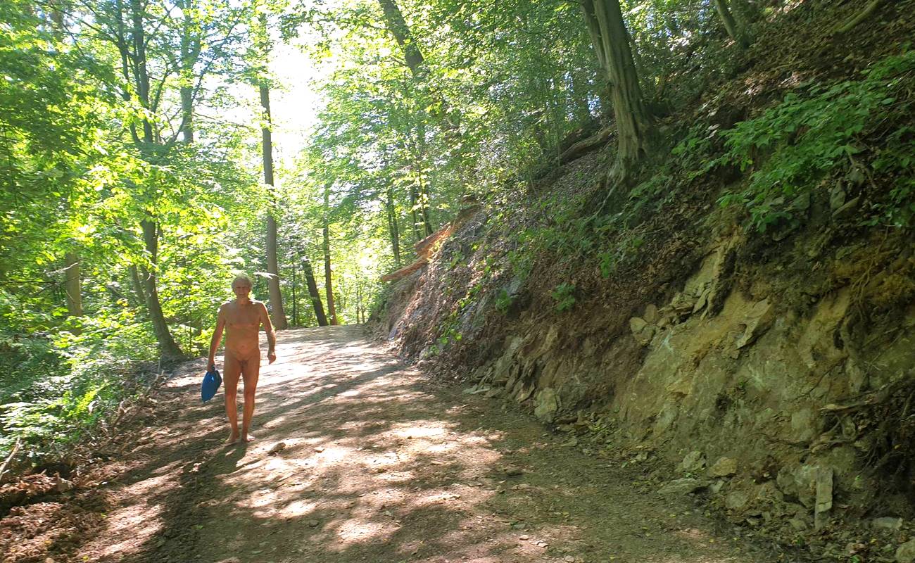 Le point de départ de la promenade se trouvait au bout d'une route où le village se fond dans les bois. Une femme avec un chien s'est exclamée : "C'est beaucoup trop rare de voir quelque chose comme ça". Plusieurs cyclistes nous ont salués et nous ont souhaité "une belle journée et une agréable jouissance de la nature". Lorsque nous avons rencontré une famille faisant du vélo, le père nous a posé quelques questions avec intérêt, entre autres sur la loi, pour savoir si la randonnée nue était autorisée.