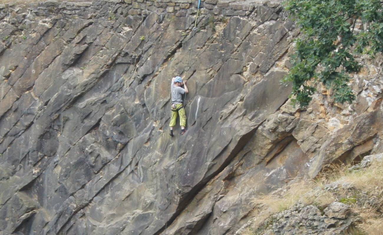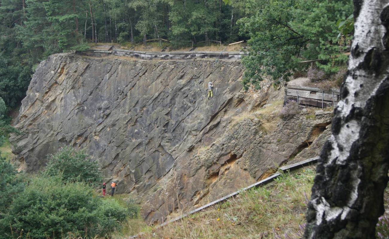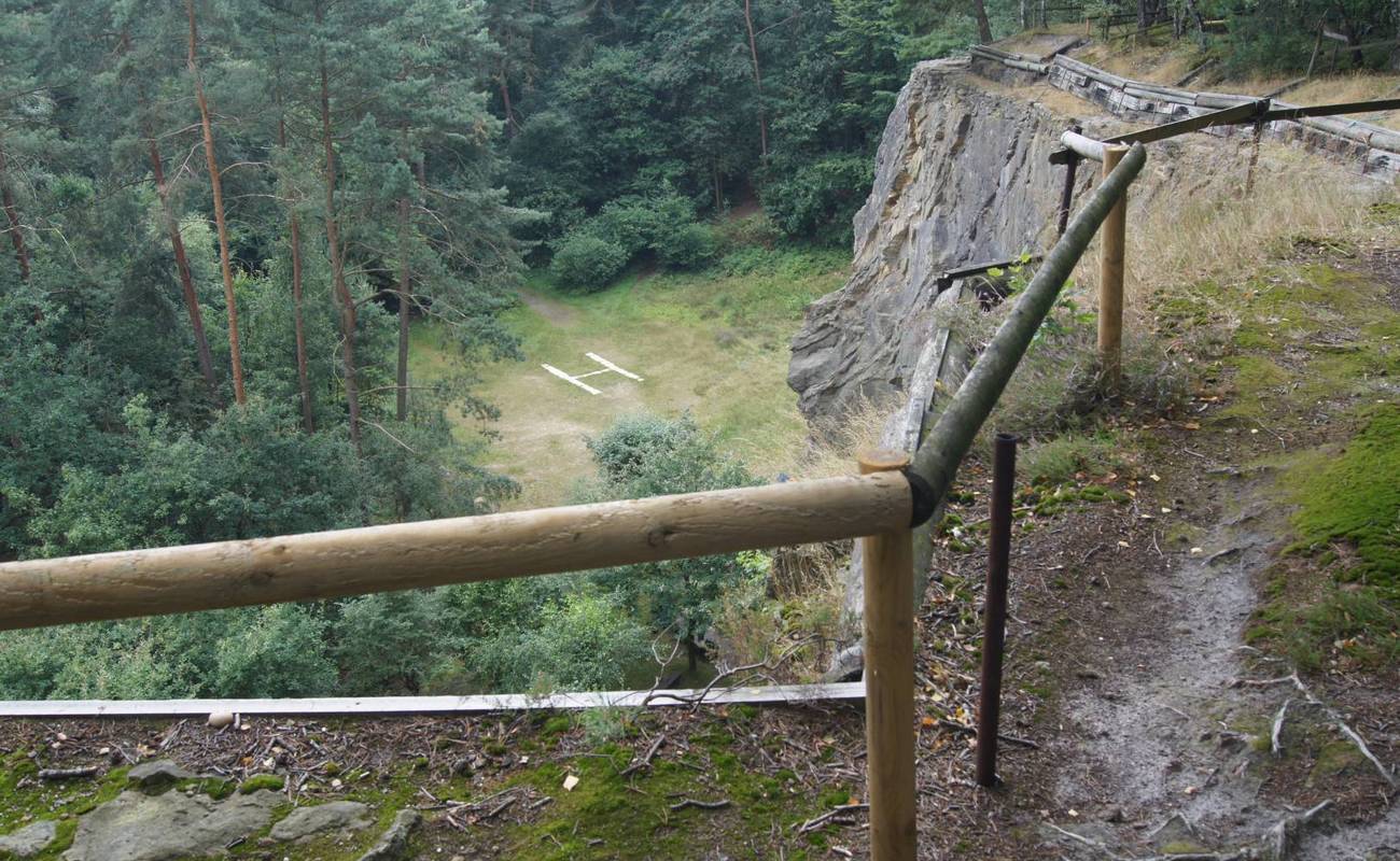 Après une montée raide, la randonnée a d'abord mené à une ancienne carrière avec des vues sur les murs de grès en pente presque verticale. Le "grès d'Ibbenbüren" a été exploité ici pendant longtemps. Aujourd'hui, la zone est louée à un club d'escalade et clôturée pour des raisons de sécurité. Un grand "H" blanc sur le sol marque le site d'atterrissage des hélicoptères de sauvetage.