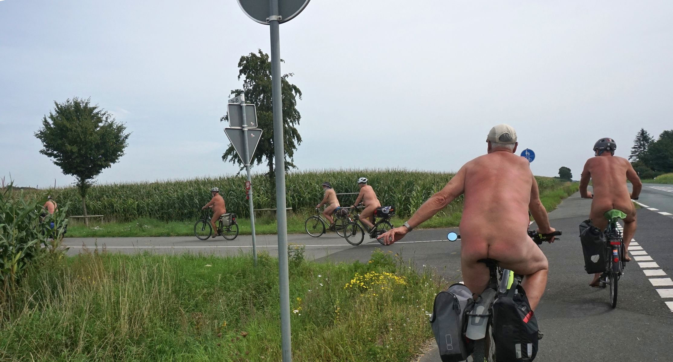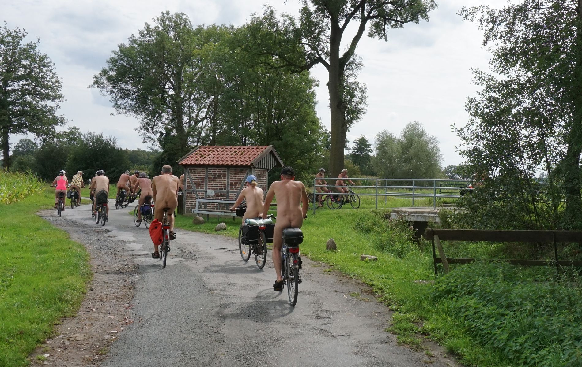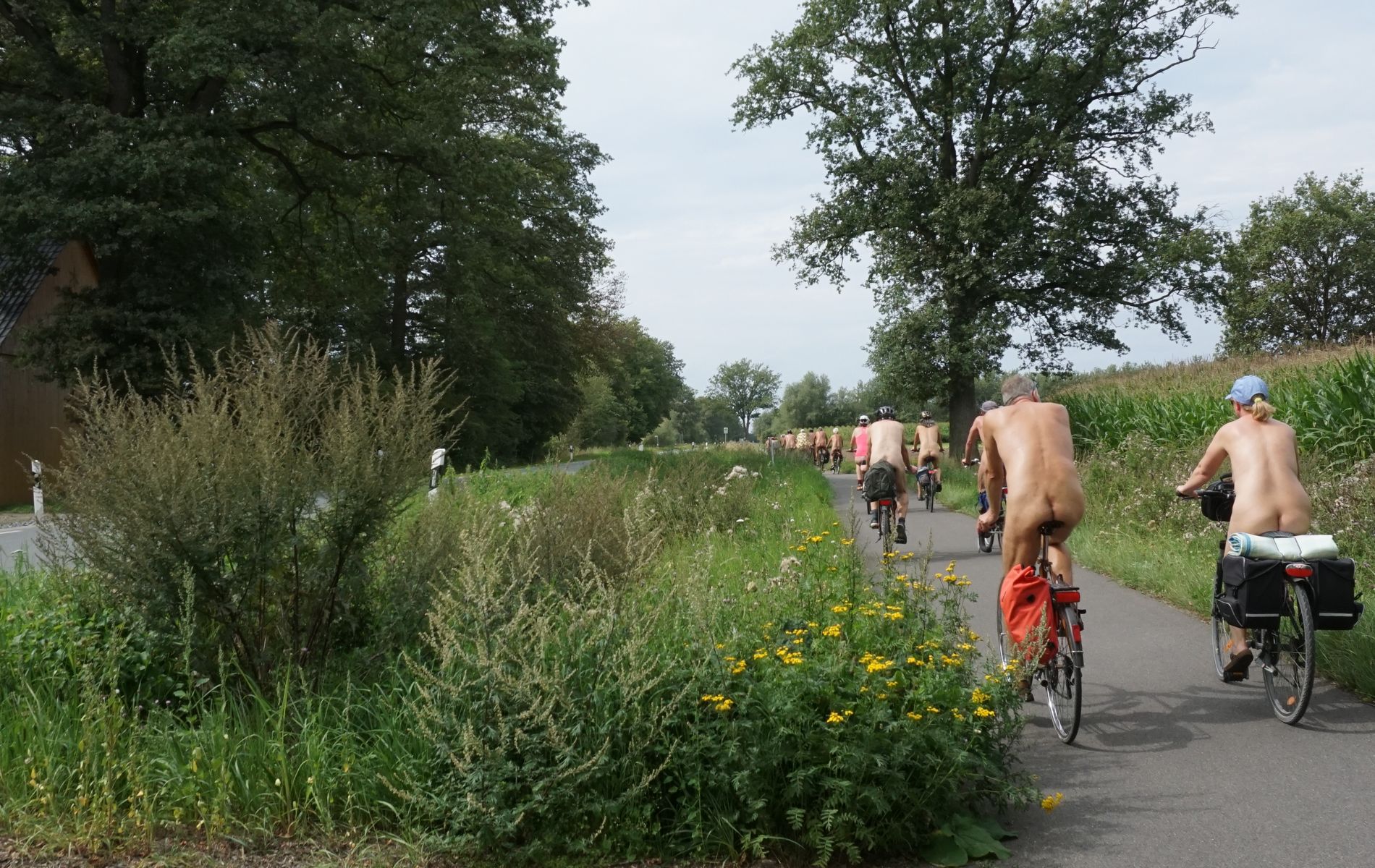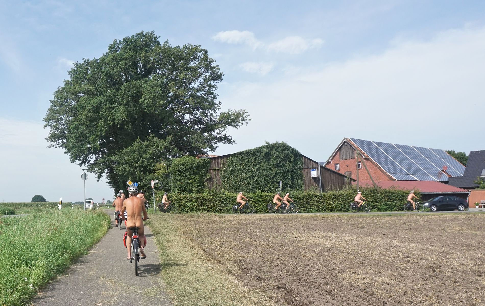 Entre Nordwalde et Emsdetten, le parcours cycliste s'étendait sur une cinquantaine de kilomètres que dix-huit naturistes se réjouissaient de parcourir. Un soleil filtré par les nuages seulement par intermittence et des températures comprises entre 23 et 26 degrés ont favorisé le bien-être grâce à un vent de circulation constant, mais aussi la nécessité d'un revêtement avec une protection solaire.